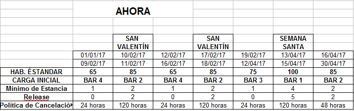 Es sin duda el primer paso a seguir y el mas importante. Comenzaremos con una serie de preguntas.: ¿Tiene en cuenta temporadas específicas para festividades tales como Semana Santa, Navidades o periodos vacacionales importantes de nacionalidades de clientes importantes para tu hotel? ¿Tienes en cuenta mínimos de estancias o release en estas fechas? ¿Necesitarás una política de cancelación diferente? Una vez hayamos dado respuesta a las preguntas anteriores pasaríamos a plasmar nuestras ideas en una hoja de excel .: