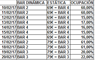 Según la tabla tal vez sea un buen momento para enviar un PARO de VENTAS los días 10-11/02 y 17-18/02 a los canales Estáticos y empezar a vender el resto de habitaciones a buen precio. Ten en cuenta que si subes las tarifas a BAR 1 en estos días estarás poniéndote la zancadilla a ti mismo ya que estarás allanando el terreno a los estáticos que tendrán precios mucho mas competitivos que tu web y los canales online.