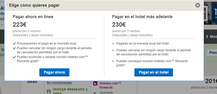Hace ya algunos años que observo un «fallo» (Ironía) al mostrar el precio público que tiene que pagar el cliente a través de la web y el precio que ofrece Expedia como método de Pago Directo en el Hotel. Casualmente siempre sale mas barato el precio de Pago a través de la web, dejando entrever una herramienta de dumping muy bien construida.