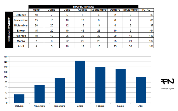 En este ejemplo se ve claramente que los meses mas fuertes son Enero, Febrero y Marzo, pero la suma de reservas anteriores a estas fechas suponen un monto importante por eso en este caso optaría por un doble Early Booking