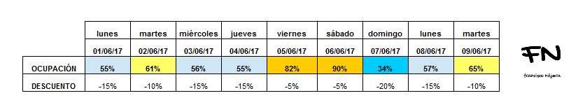 Una vez tengamos la información nos tocas elaborar los descuentos. En principio esto es mas sencillo ya que si hemos hecho el estudio previo de nuestro histórico sabremos cuantas reservas entraron con Early Booking y cuantas a posteriori así podremos saber que producción esperar de dicho TTOO o Nacionalidad de cliente.